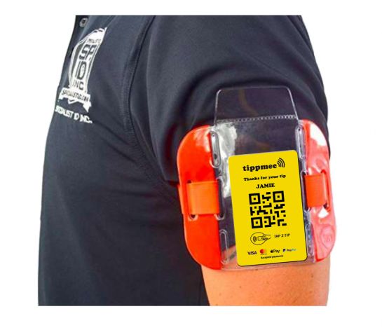 Slide on your arm band holder with your personalised card and get your customers to scan or tap your card to tip you